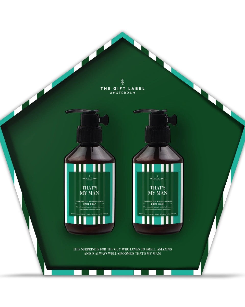 Gavesett til han fra The Gift Label. Denne flotte THATS´S MY MAN gaveesken inneholder både hånd- og dusjsåpe med den nye duften av Tangerine Zest & Tobacco Leaves. Motvirker tørr hud, holder den myk, og etterlater en nydelig frisk duft. Den perfekte gaven, eller reisesett til han.